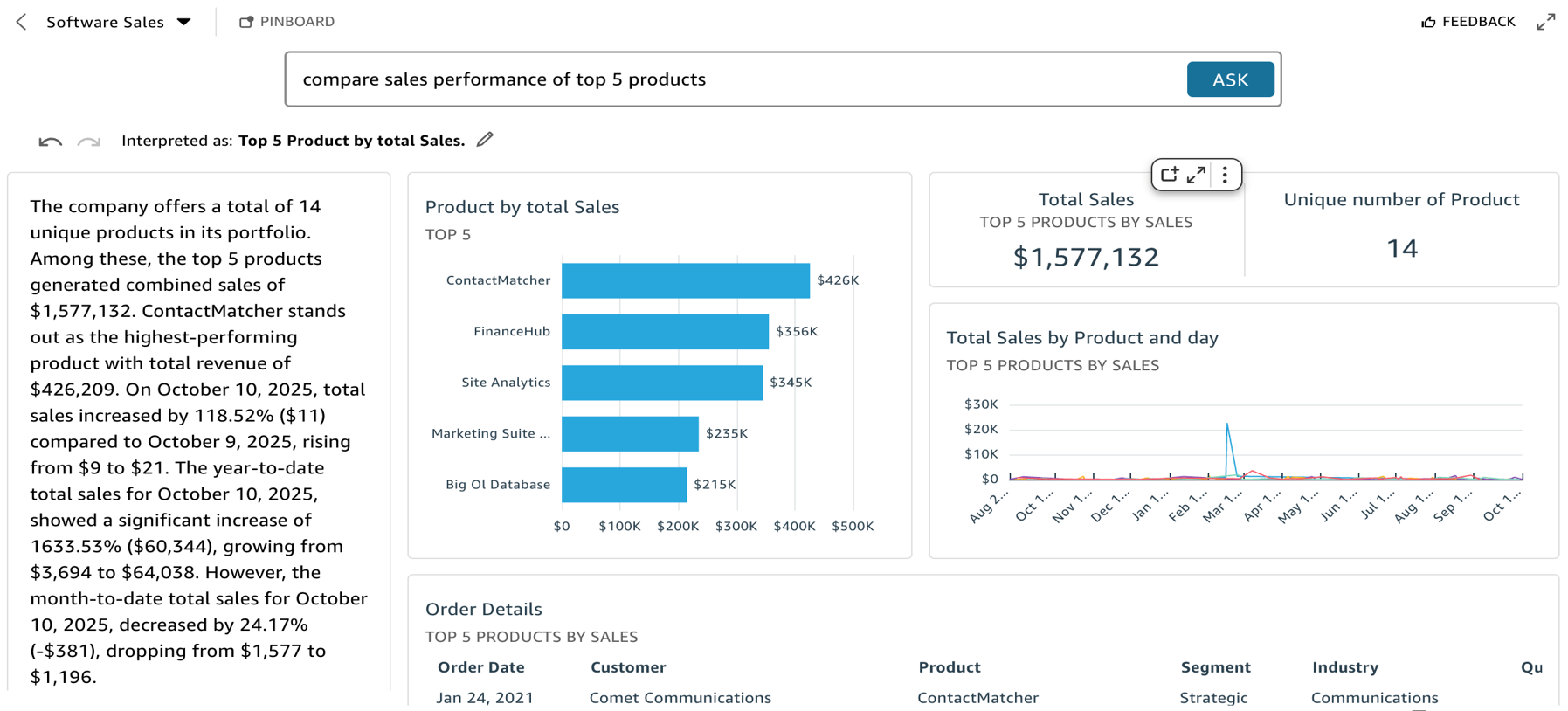 Ask questions about SAP data in plain English and receive comprehensive responses with charts and context.